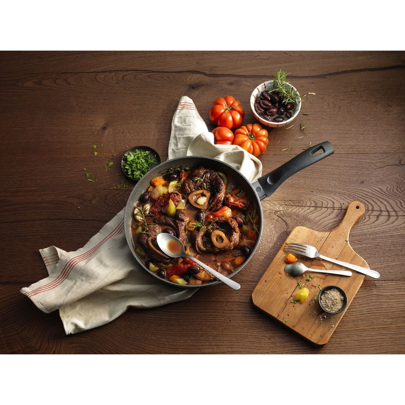 Nella padella della linea Ferrara Granitium di BALLARINI puoi preparare piatti sani e deliziosi in un batter d’occhio. Il rivestimento antiaderente GRANITIUM a 5 strati ti permette di ridurre l’utilizzo di oli e grassi, per cucinare in modo più salutare senza rischiare che le pietanze si attacchino o brucino durante la cottura. Inoltre, l’ulteriore rinforzo con particelle minerali rende il rivestimento ancora più resistente, così potrai anche usare spatole e altri utensili in metallo senza alcun problema. Questo padella di alta qualità firmato BALLARINI stupisce anche in termini di maneggevolezza: il manico ergonomico garantisce una presa sicura e rimane freddo grazie a un ottimo isolamento termico. La protezione ignifuga in acciaio inossidabile garantisce ulteriore protezione dal calore in aumento sui lati. Il dispositivo Thermopoint integrato nel manico è un ottimo alleato per evitare gli sprechi energetici e ti aiuta a cuocere o arrostire a puntino i tuoi piatti più sfiziosi. Quando il Thermopoint è di colore rosso potrai abbassare la fiamma, mentre il verde indica che il padella si è raffreddato e può essere maneggiato senza alcun pericolo. Questa padella, oltre a essere adatta alla lavastoviglie, può anche essere risciacquata con un panno umido. Il massiccio nucleo in alluminio del fondo bimetallico conserva il calore e lo diffonde in maniera uniforme. È possibile utilizzare la padella su tutti i tipi di piani cottura, compresi quelli a induzione. Affidati alla padella della linea Ferrara Granitium di BALLARINI con diametro di 24 cm e vizia i tuoi ospiti e la tua famiglia con squisiti piatti preparati con cura e attenzione al risparmio energetico.