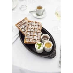 Adatto a servire il pesce direttamente dal forno alla tavola: è possibile, per esempio, far cuocere delicatamente del gustoso pesce nel piatto da portata Staub per poi portarlo direttamente in tavola. L’elegante design ovale, di colore nero, attira l’attenzione sui vostri piatti a base di pesce, presentandoli con stile. Il piatto da portata può contenere fino a 0,7 litri e il suo stile si distingue grazie al pomello in ottone del suo coperchio. Il coperchio presenta inoltre delle piccole semisfere che consentono la redistribuzione della condensa accumulata sul pesce, lasciandolo succoso durante la cottura e preservandone i sapori. Il piatto è lungo complessivamente 36 cm (inclusi i manici), alto 8,4 cm e largo 20 cm. Questo piatto da portata Staub ovale si distingue per il moderno design ispirato alla cucina francese classica. Il materiale è robusto e facile da pulire e consente di cucinare piatti come ad esempio pesce fresco per parenti e amici e di presentarli con autentico stile.